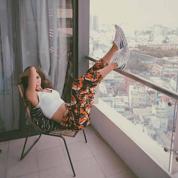 Minh Tú chọn phong cách năng động hơn với cách diện áo crop-top cùng quần jogger họa tiết và giày sneakers trắng trẻ trung.