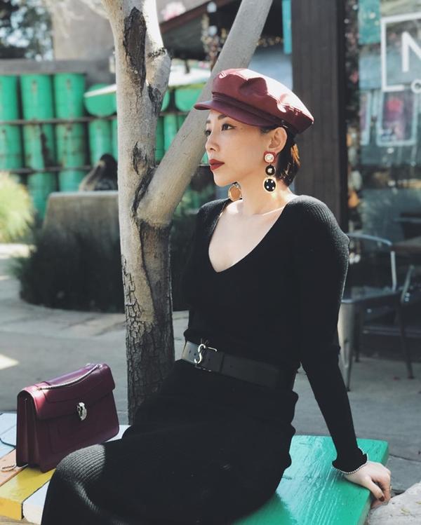 Tóc Tiên lựa chọn mẫu đầm hở ngực tông đen cùng túi xách và mũ baker boy sắc đỏ burgundy. Cô khéo léo tạo điểm nhấn vòng eo bằng thắt lưng logo của nhà mốt Saint Laurent.