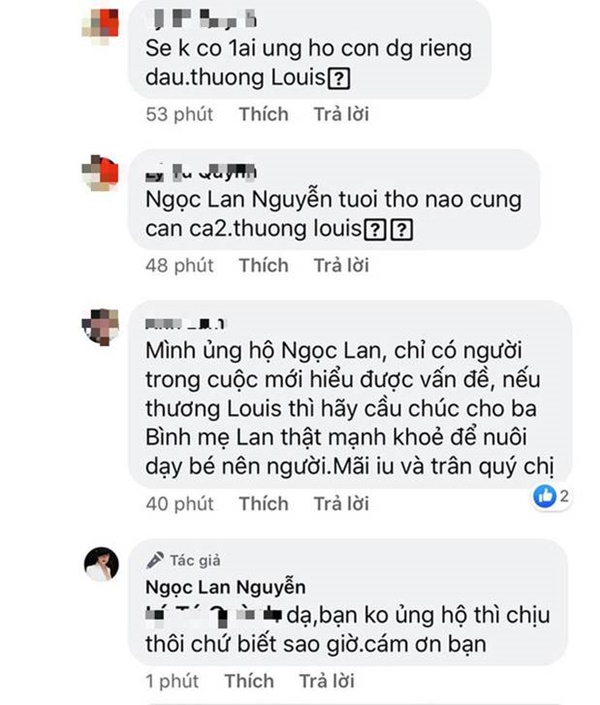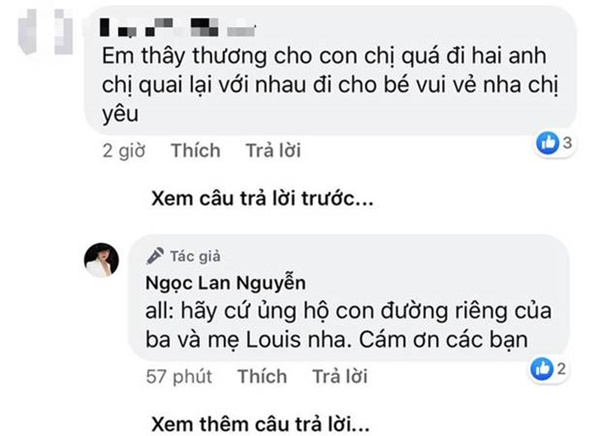 Cụ thể, khi dân mạng đồng loạt khuyên nữ diễn viên nên tái hợp với chồng cũ để mang đến niềm vui và hạnh phúc cho bé Luois Nguyễn - con trai cưng của Ngọc Lan và Thanh Bình thì cô lại có phản ứng gây bất ngờ. Thay vì phớt lờ mọi bàn luận như trước, Ngọc Lan lại thẳng thắn trả lời: "Tất cả mọi người hãy cứ ủng hộ con đường riêng của ba và mẹ Luois nha. Cảm ơn các bạn". Tuy nhiên, ngay sau đó đã xuất hiện một vài bình luận tỏ ý không cảm thông cho nữ diễn viên, cô liền "xù lông" đáp trả cực thẳng thắn: "Dạ, bạn không ủng hộ thì chịu thôi chứ biết sao giờ, cảm ơn bạn".