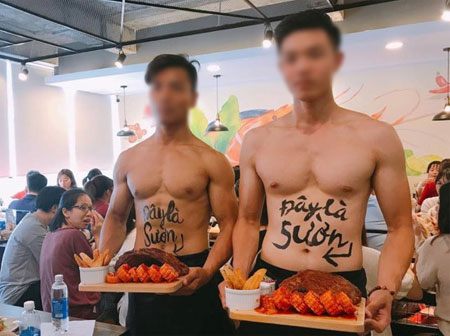 Màn bưng món ăn ra tận bàn cho khách của các chàng trai có thân hình săn chắc nhận được nhiều ý kiến trái chiều trên mạng.