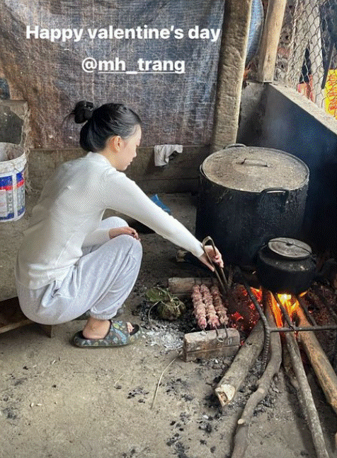 Gây bất ngờ nhất có lẽ là hình ảnh Mai Hà Trang, bạn gái Hà Đức Chinh ngồi bên bếp củi đun nước, nướng thịt. Không còn là nàng thơ xinh đẹp như những tấm ảnh cô thường đăng trên trang cá nhân, Mai Hà Trang ăn bận đơn giản ở nhà bạn trai, không ngại củi lửa để vào bếp. Đức Chinh quả là may mắn khi có một cô bạn gái bên ngoài xinh đẹp, bên trong đảm đang thế này.
