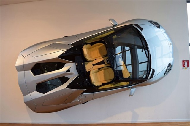 Hầu hết các mẫu xe quan trọng của Lamborghini đều được trưng bày gần cửa kính để hứng ánh sáng ngoài trời. |
