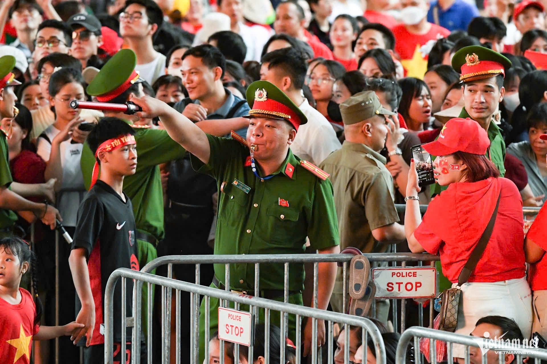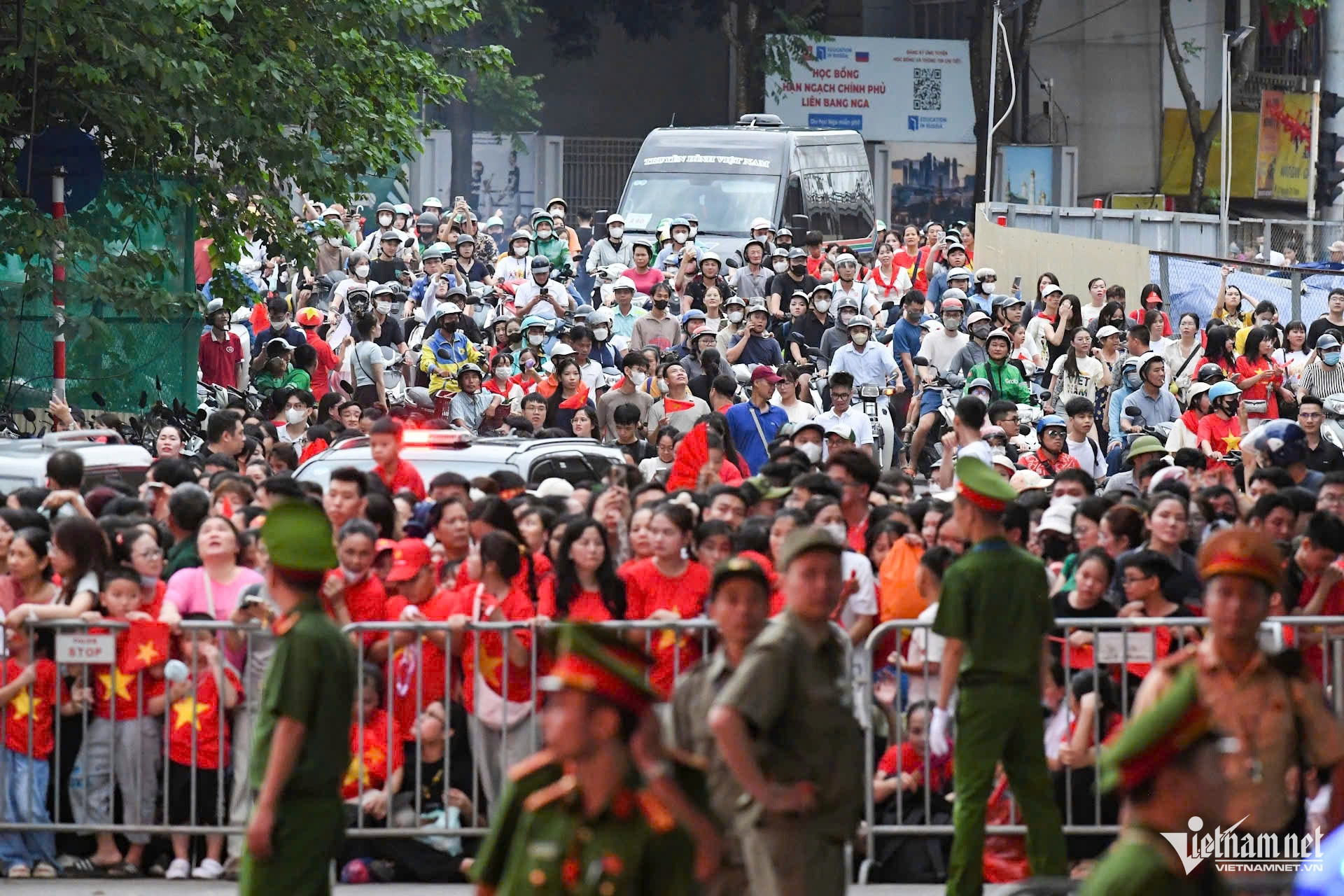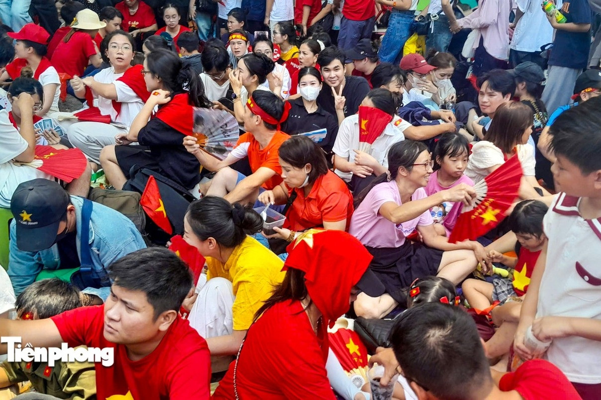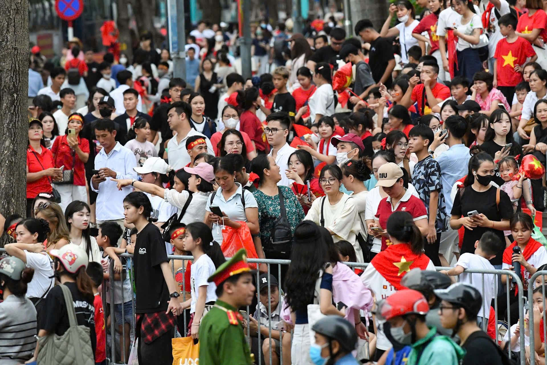 Dù chỉ mới hơn 15h, người dân tại ngã giao Hùng Vương - Nguyễn Thái Học - Hàng Cháo đã ngồi xếp hàng chật kín để chờ xem đoàn diễu binh, diễu hành.
