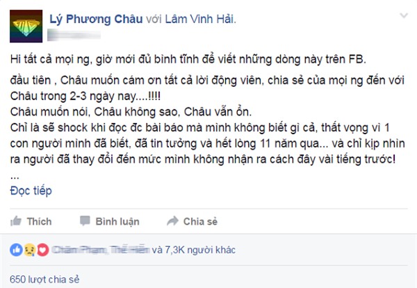 Ngỡ chuyện tình mới là tin vui cho showbiz Việt dịp đầu năm, nhưng chỉ cách đây ít giờ, Lý Phương Châu - vợ cũ Lâm Vinh Hải chính thức lên tiếng về nguyên nhân hôn nhân đổ vỡ. Theo lời họ Lý chia sẻ về chồng cũ, thì Lâm Vinh Hải là người phản bội, cặp kè với Linh Chi khi họ trên pháp lý vẫn còn là vợ chồng.