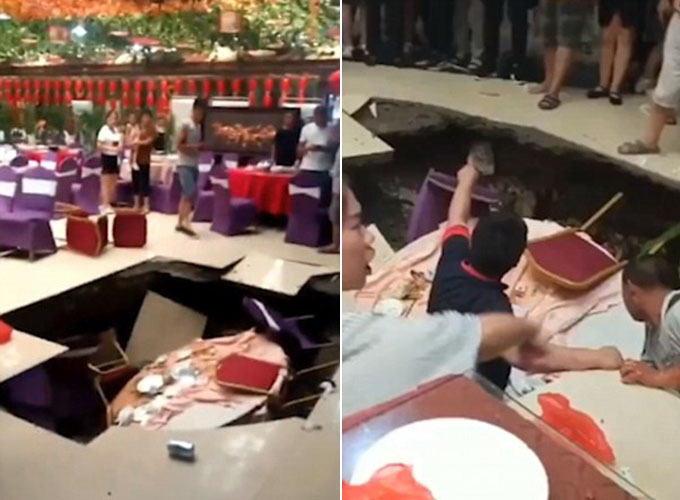 Một hố tử thần bất ngờ xuất hiện tại khu tiệc cưới, nuốt chửng chiếc bàn lớn và 6 khách mời đang ngồi ăn. Đoạn video ghi lại tại hiện trường cho thấy một số nạn nhân được những người khác kéo lên khỏi hố sâu.