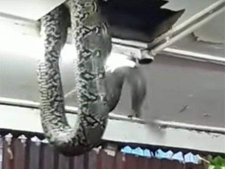 Một con rắn khổng lồ, trông giống trăn, bằng cách nào đó đã chui lên mái nhà của một cửa hàng.