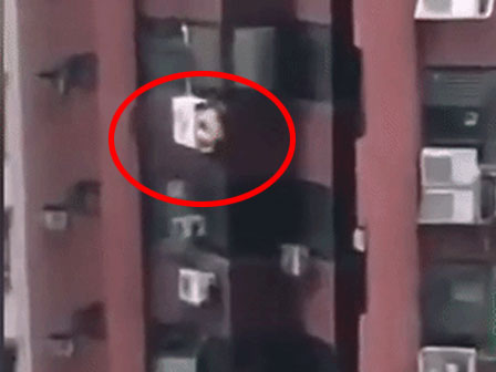 Gã trai đánh đu trên cục nóng điều hòa treo lơ lửng giữa tòa nhà chung cư.