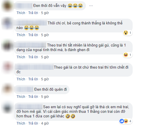Và ngoài những bình luận như trên, cũng có không ít chị em hài hước hơn khi nói: "Thôi kệ thà theo trai hơn theo gái", hoặc "sao em lại có suy nghĩ quái gở là thà chồng em mê trai, đỡ hơn mê gái. Vì cái cảm giác mình thua 1 thằng con trai còn đỡ hơn thua 1 đứa con gái khác". Bên cạnh đó, một số chị em khác lại "phóng" vào hỗ trợ cô vợ đang hoang mang bên trên phân tích tâm lý của chồng, để từ đó hy vọng có thể phanh phui vấn đề và tìm ra đáp án cho các câu hỏi xoay quanh giới tính thật của anh chồng đó.
