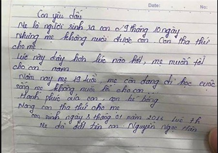 Tức tốc tới nơi, các đồng chí công an thấy một cháu bé được bao bọc quần áo ấm, để trong chiếc thùng ở gốc cây. Bên cạnh cháu bé người dân còn phát hiện một lá thư có nội dung "gửi gắm" cho ai đó sẵn sàng cưu mang cháu và lời xin lỗi vì người mẹ này không đủ điều kiện nuôi dưỡng con mình đẻ ra.