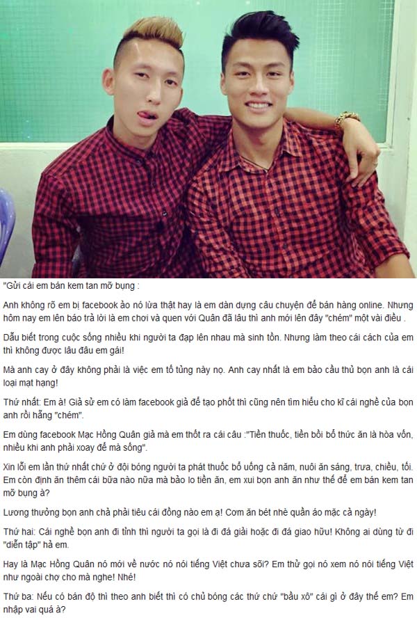 Ngày 11/1, một tài khoản FB bất ngờ tố Mạc Hồng Quân quỵt tiền 15 triệu đồng, cũng như có các phát ngôn cực phũ về bạn gái cũ Ly Kute cũng như giới cầu thủ của anh trên mạng xã hội.