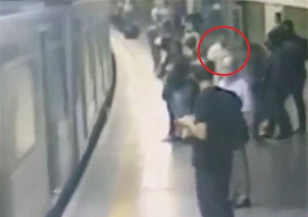 Trong khinhiều hành khách đang đứng đợi chuyến tàu, gã đàn ông mặc áo màu trắng đã bất ngờ xô mạnh một nữ hành khách khiến cô này ngã chúi đầu về phía đường ray.