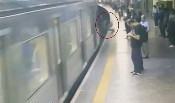 Đồng thời, một đoàn tàu cũng tiến nhanh vào bến và cố gắng giảm chậm tốc độ nhưng không kịp dừng hẳn. Nó vẫn lao qua vị trí mà nạn nhân xui xẻo vừa ngã xuống.