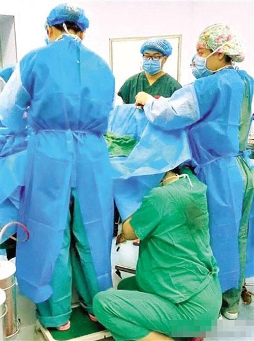 Hình ảnh nữ y tá quỳ gối hỗ trợ ca phẫu thuật được lan truyền mạnh mẽ trên mạng xã hội.