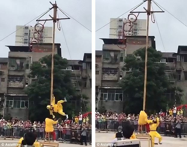 Ngày 17/6 vừa qua, một nghệ sĩ xiếc đường phố trong trang phục Tôn Ngộ Không thực hiện nhào lộn trên cột tre tại quận Giang Tân, thành phố Trùng Khánh đã bất ngờ bị ngã từ trên cao trong ánh mắt kinh hoàng của những người xung quanh.