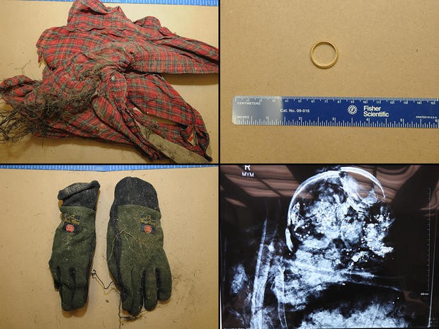 Di vật của nạn nhân (bao gồm 1 chiếc nhẫn cưới) được tìm thấy dưới hồ Carr. Ảnh phía dưới bên phải là hình chụp X-quang hộp sọ của Mike Williams.
