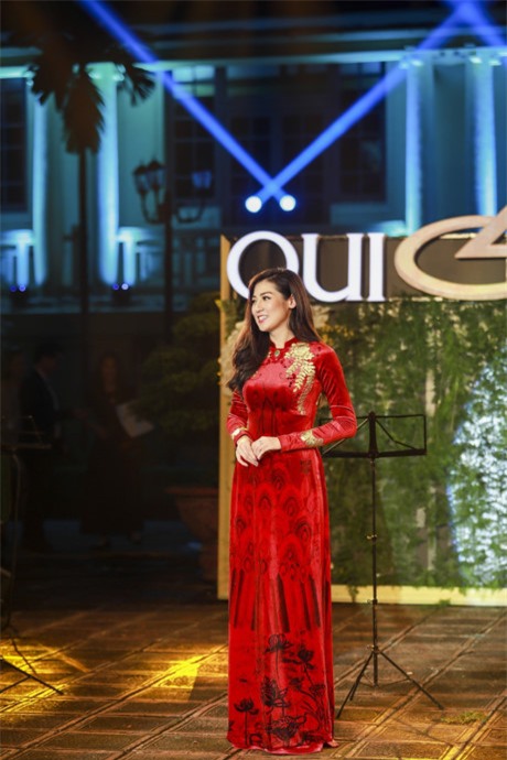 Á hậu Tú Anh duyên dáng trong trang phục áo dài truyền thống sắc đỏ dát vàng.
