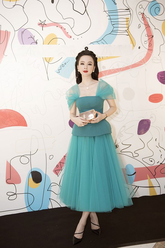Angela Phương Trinh chọn chiếc đầm tulle xanh ngọc dịu dàng khoe làn da trắng sáng, kiểu dáng váy midi cùng phần vai thiết kế mỏng tang khiến Angela Phương Trinh trông như một quý cô sang trọng và vô cùng quyến rũ.