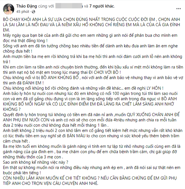 Cô tố chồng cũ mượn tiền vợ và bố mẹ vợ để làm ăn nhưng lấy lý do làm đám cưới bị lỗ nên không trả lại. Lúc Đặng Thu Thảo làm ra tiền thì chồng cũ nói chuyện bình thường, khi bầu bí không đi làm được thì bị chồng và nhà nội bỏ mặc. Sốc nhất là việc Đặng Thu Thảo bị bồ nhí của chồng khủng bố tinh thần, lại thêm chồng về đánh đập khiến cô có lúc trầm cảm đến nỗi chết lâm sàng.
