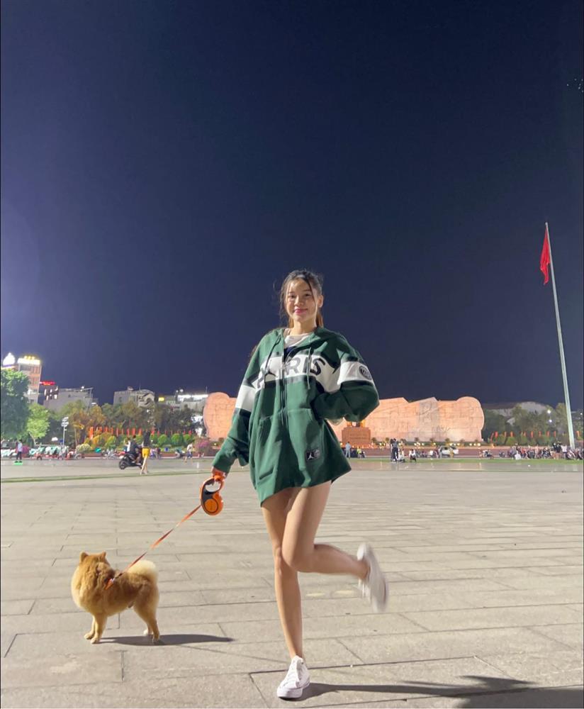 Hình ảnh cho thấy, Yến Xuân cùng chú cún cưng đứng bên ngoài sân, cách vị trí Đặng Văn Lâm luyện tập một khoảng khá xa. Cô dùng điện thoại ghi lại khoảnh khắc bạn trai đang tập bóng.