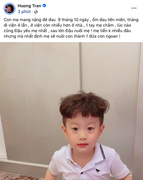 Chưa dừng lại ở đó, Hương Trần còn có bài đăng tiếp theo nhắn nhủ con trai: "Con mẹ mang nặng đẻ đau 9 tháng 10 ngày, ốm đau liên miên, tháng đi viện 4 lần, ở viện còn nhiều hơn ở nhà, 1 tay mẹ chăm, lúc nào cũng Đậu yêu mẹ nhất sau lớn Đậu nuôi mẹ! Mẹ tiền không nhiều đâu nhưng mà nhất định mẹ sẽ nuôi con thành 1 đứa con ngoan!".