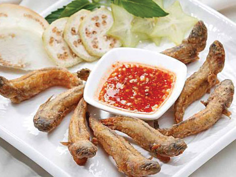 Xếp cá ra dĩa, cho chén nước mắm me vào giữa, ăn kèm với ít đồ chua hoặc dưa leo, chuối chát.