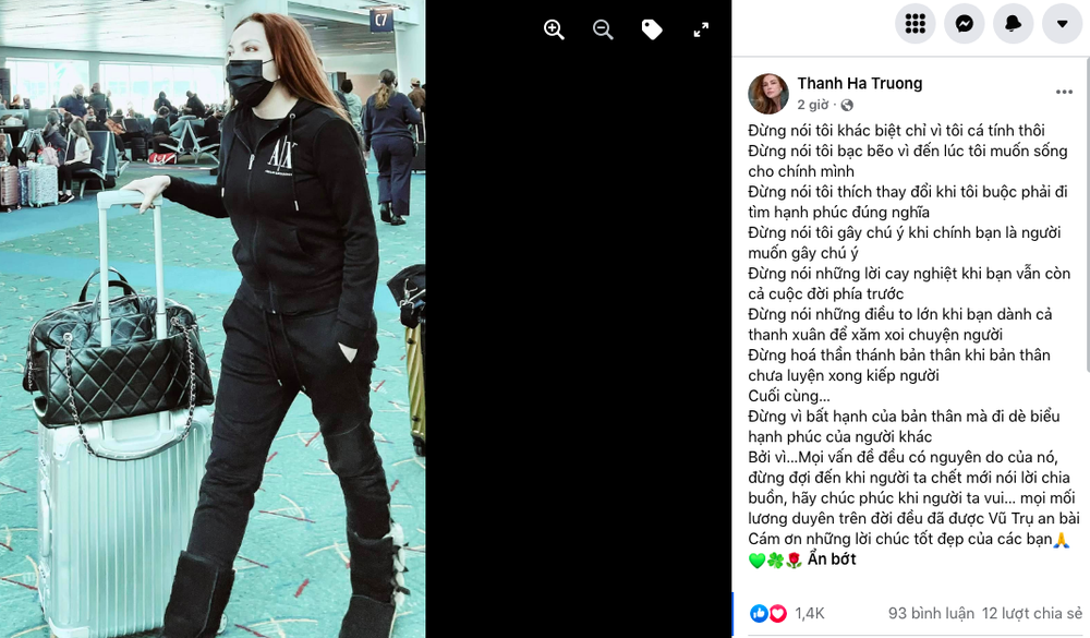 Khi bị soi mói chuyện đời tư, Thanh Hà vừa đăng tải bức hình đi hiên ngang ở sân bay kèm dòng trạng thái: "Đừng nói tôi khác biệt chỉ vì tôi cá tính thôi. Đừng nói tôi bạc bẽo vì đến lúc tôi muốn sống cho chính mình.