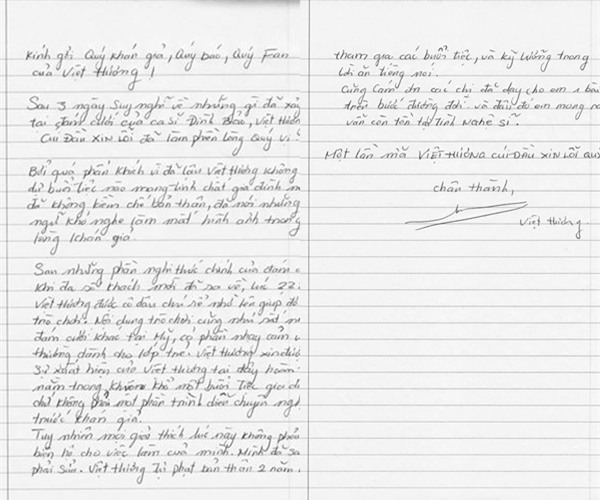 Từ mở đầu cho tới kết thúc bức thư tay, Việt Hương nhắc đi nhắc lại: "Việt Hương xin cúi đầu xin lỗi vì đã làm phiền lòng quý vị".