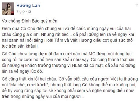 Ngay sau đó trên trang cá nhân, trong phần giải thích lý do vì sao mình đứng dậy giữa lúc tiệc còn đang vui, ca sĩ Lan Hương nói với nam ca sĩ Đình Bảo: "Cô chú chưa từng dự một đám cưới nào mà MC đứng nói dung tục xong rồi tự cười hô hố trên sân khấu như vậy. Cô cũng thành thật xin lỗi những vị khách trưởng thượng vì Hương Lan đã có mặt, đã xấu hổ đứng lên ra về ngay lúc đó".