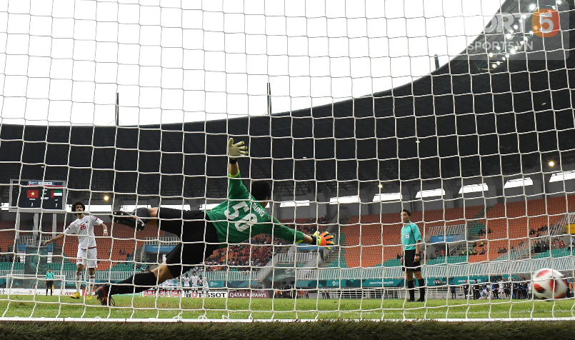 Thói quen đổ người muộn đã giúp Bùi Tiến Dũng thành người hùng ở U23 châu Á 2018, nhưng nó cũng khiến thủ thành này "bó tay" toàn tập trước 4 quả đá của Olympic UAE. Cả 4 cú sút này đều đi vào góc thấp bên trái khung thành.