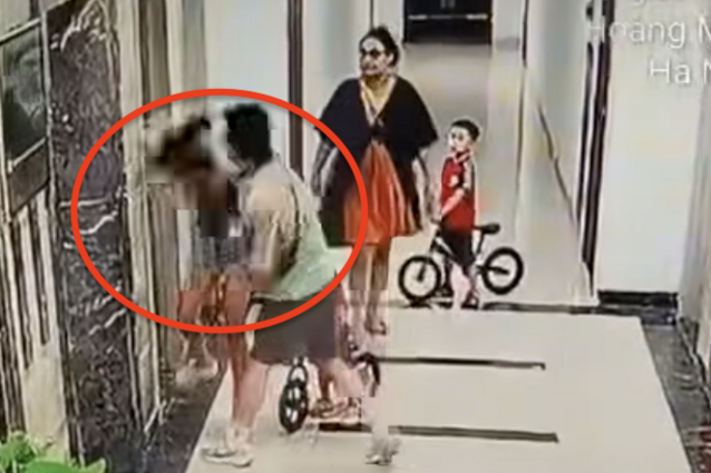 Người phụ nữ bị gã đàn ông hành hung tại sảnh chung cư. (Ảnh cắt từ clip)