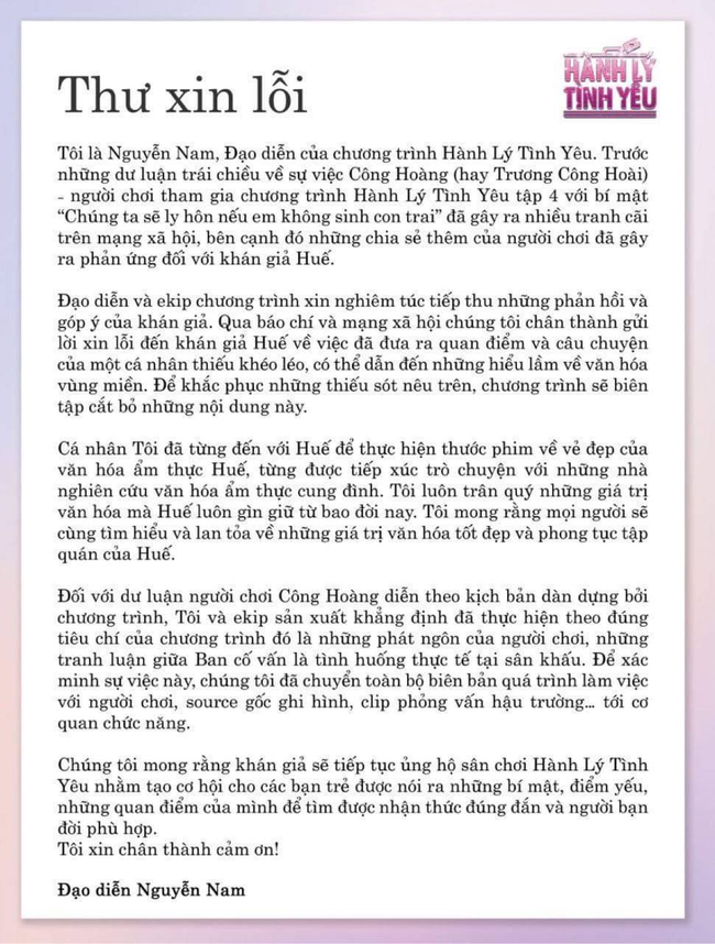 Giữa lùm xùm chưa kết thúc, ekip sản xuất của chương trình Hành lý tình yêu đã đưa ra lời xin lỗi chính thức đến khán giả.
