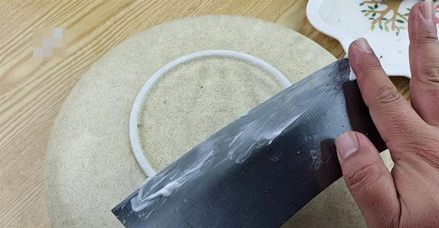 Dao bếp sau khi được làm sạch sẽ bước vào giai đoạn mài, nếu có đá mài ở nhà là tốt nhất, không có thì bạn có thể kiếm một chiếc bát, đĩa sứ thay thế. Hãy lật ngược chiếc bát và dùng phần nhám ở phía dưới để mài dao.