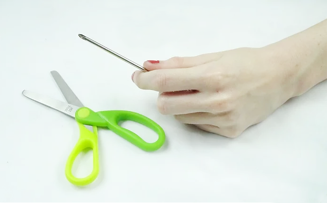 Cách làm: Bạn chuẩn bị một cái đinh ghim, đùng kéo cắt vào đinh ghim sao cho cây đinh ghim trượt ở giữa hai lưỡi kéo.