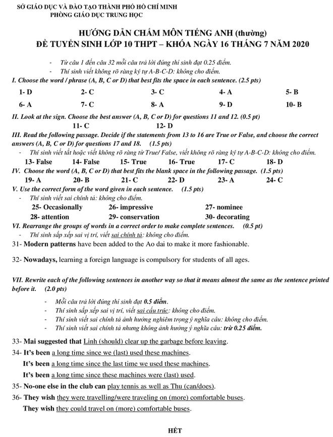 Đáp án chính thức môn tiếng Anh vào lớp 10 TP.HCM năm 2020: