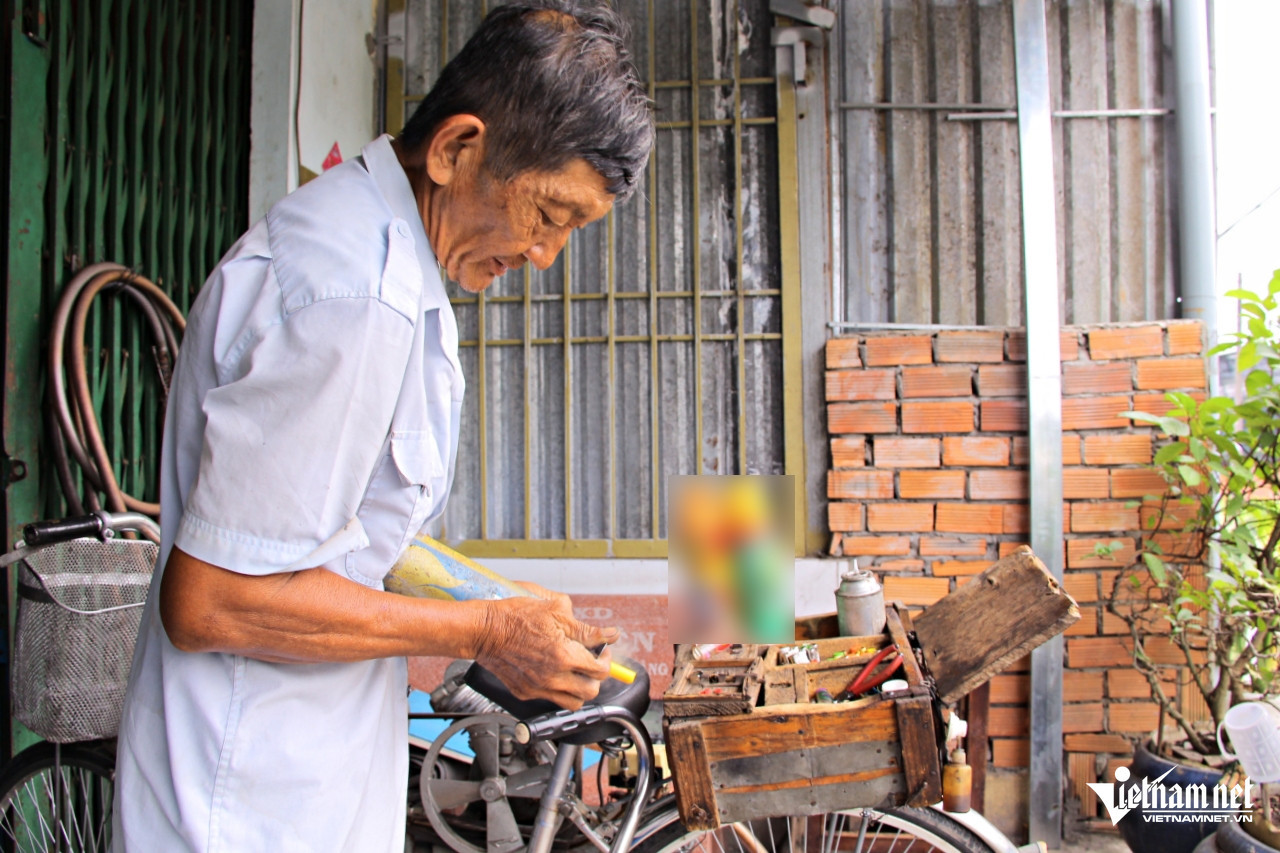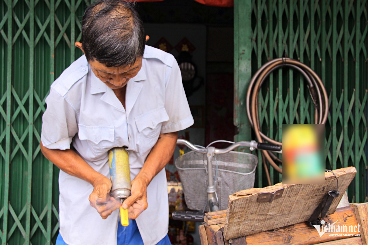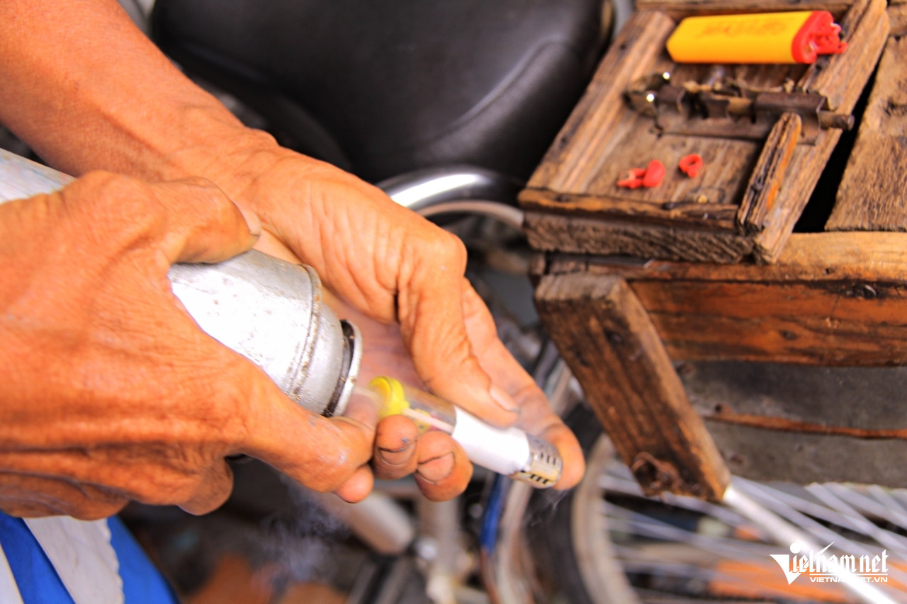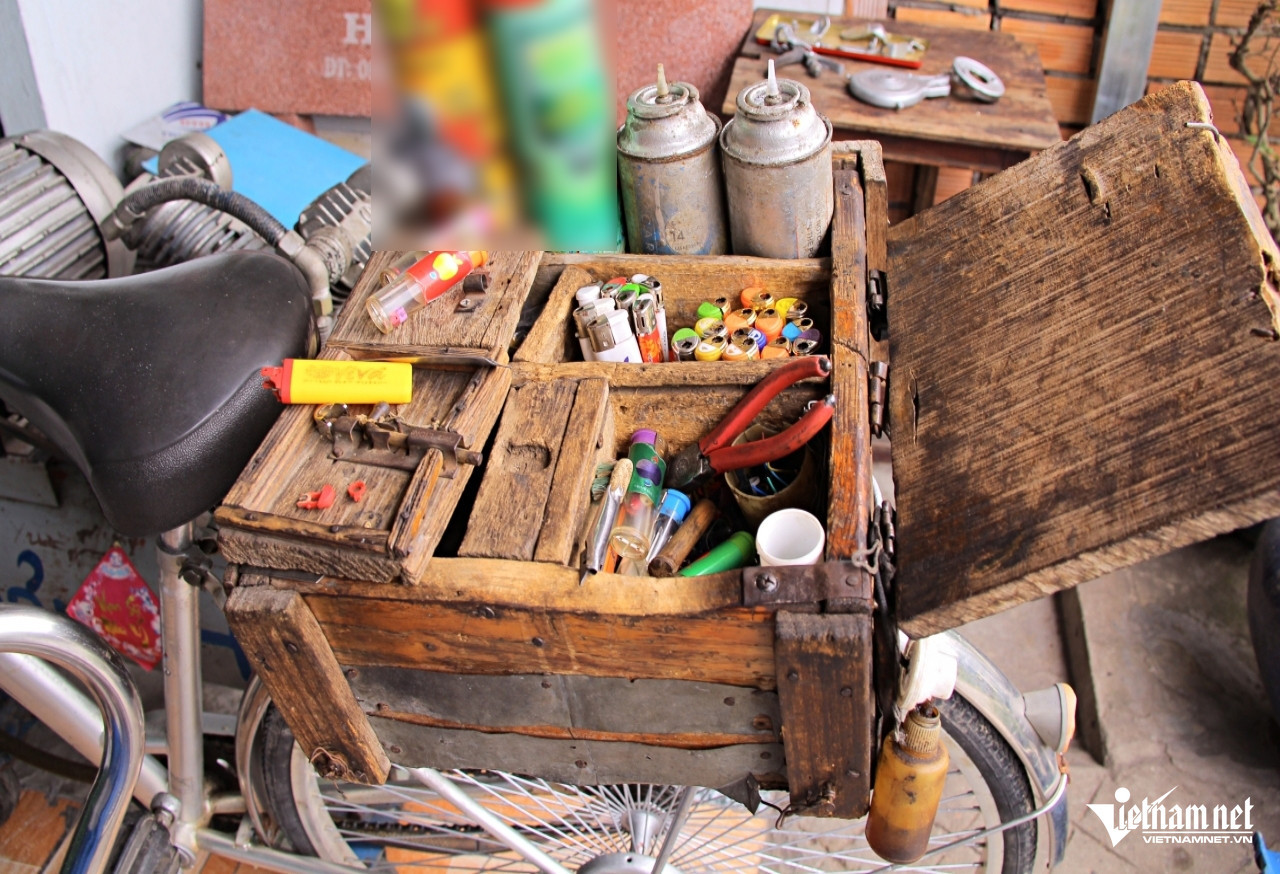 Ra đến hiên nhà, ông đứng bên chiếc xe đạp cũ, yên sau có gắn hộp gỗ chứa vài bình gas mini cùng dăm ba chiếc bật lửa cũ. Người khách đang vội, chỉ kịp gửi cho ông chiếc bật lửa hết gas nhờ ông bơm rồi đi mất.