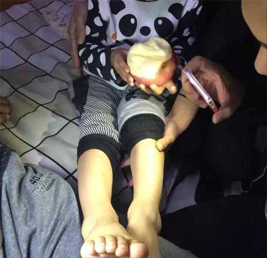 Chân cậu bé xuất hiện dấu vết bị kim đâm.