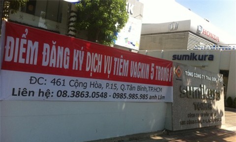Trước tòa nhà có hẳn một băng rôn với dòng chữ: “Điểm đăng ký dịch vụ tiêm vắc xin 5 trong 1” và 2 số điện thoại để liên lạc. Chỉ đơn sơ và ngắn gọn như vậy nhưng theo ghi nhận của chúng tôi trong sáng ngày 15-12, có rất đông phụ huynh đến địa chỉ này để đăng kí một suất tiêm vắc xin cho con em mình.