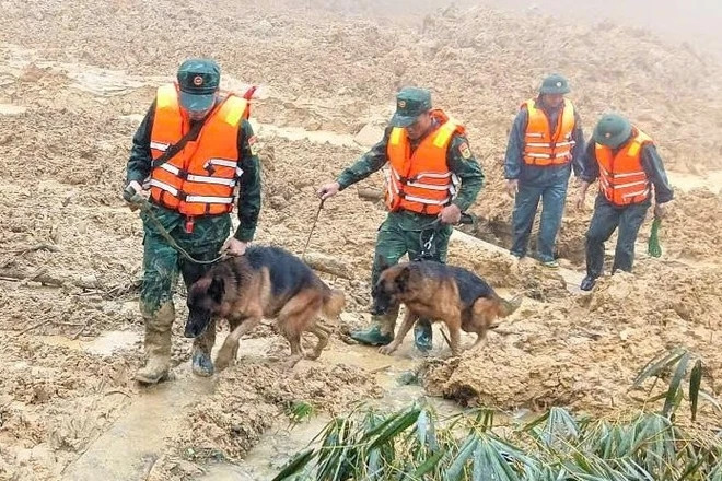 Sáng 16/11, hàng trăm cán bộ, chiến sĩ cùng chó nghiệp vụ đã tiếp cận hiện trường vụ sạt lở để tìm kiếm các nạn nhân mất tích. Tuy nhiên, trước diễn biến thời tiết xấu, công tác tìm kiếm đã phải tạm dừng.