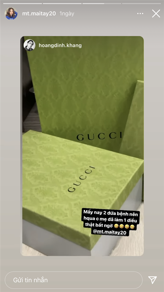 Vốn dĩ Mai không tiết lộ danh tính người tặng nhưng thiếu gia Sài thành lại không ngại chia sẻ: "Mấy nay 2 đứa bệnh nên hôm qua 'chị' mẹ đã làm 1 điều thật bất ngờ". Kèm theo đó, Đình Khang xếp cả loạt hộp Gucci - điều bất ngờ mà mẹ anh chàng dành cho cặp đôi.