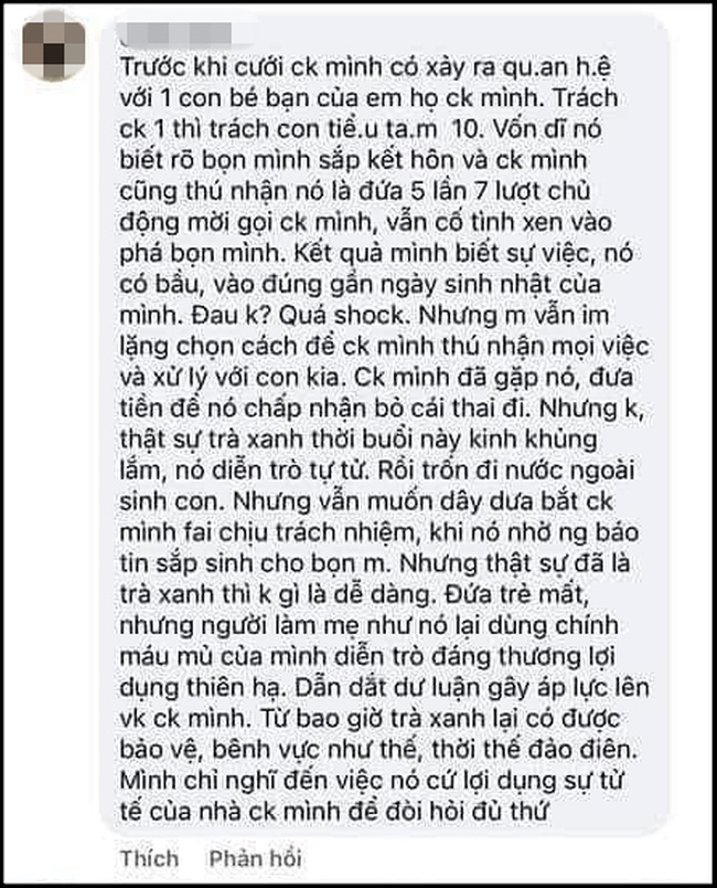 "Trước khi cưới chồng mình có xảy ra quan hệ với một con bé bạn của em họ chồng. Trách chồng 1 thì trách tiểu tam 10. Vốn dĩ nó biết rõ bọn mình sắp kết hôn và chồng mình cũng thú nhận nó là đứa 5 lần 7 lượt chủ động mời gọi chồng mình, cố tình xen vào phá bọn mình. Kết quả mình biết sự việc, nó có bầu, vào đúng gần ngày sinh nhật của mình.