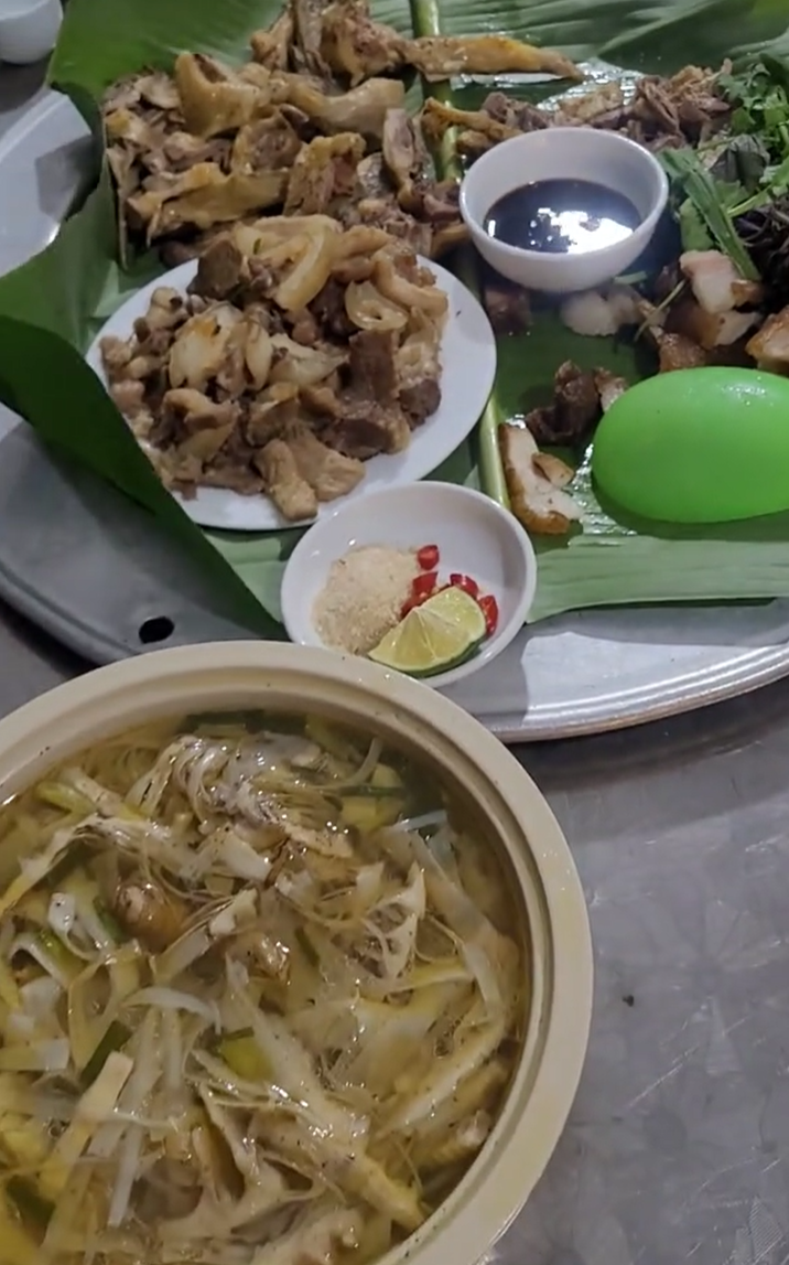 Ngoài các món quen thuộc như xôi, gà luộc, trong mâm cỗ còn bày biện loạt món ngon như cá chiên xù, tôm chiên, thịt dê chao tỏi, bê xào măng… Trong số những món ăn đó, chị Ngọc Quyên thích nhất là món ba ba om chuối.