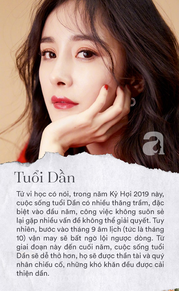 Tử vi học có nói, trong năm Kỷ Hợi 2019 này, cuộc sống tuổi Dần có nhiều thăng trầm, đặc biệt vào đầu năm, công việc không suôn sẻ lại gặp nhiều vấn đề không thể giải quyết. Tuy nhiên, bước vào tháng 9 âm lịch (tức là tháng 10) vận may sẽ bất ngờ lội ngược dòng. Từ giai đoạn này đến cuối năm, cuộc sống tuổi Dần sẽ dễ thở hơn, họ sẽ được thần tài và quý nhân chiếu cố, những khó khăn đều được cải thiện dần. Trước khi bước sang năm 2020, có khả năng gặp được cơ hội làm giàu, đổi vận đổi đời.