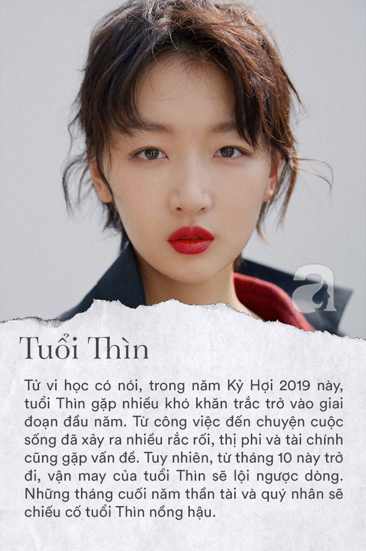 Tử vi học có nói, trong năm Kỷ Hợi 2019 này, tuổi Thìn gặp nhiều khó khăn trắc trở vào giai đoạn đầu năm. Từ công việc đến chuyện cuộc sống đã xảy ra nhiều rắc rối, thị phi và tài chính cũng gặp vấn đề. Tuy nhiên, từ tháng 10 này trở đi, vận may của tuổi Thìn sẽ lội ngược dòng. Những tháng cuối năm thần tài và quý nhân sẽ chiếu cố tuổi Thìn nồng hậu, dù không thể một lần giải quyết được hết những vấn đề khó khăn nhưng tất cả đều có chuyển biến tích cực, đặc biệt con đường tài vận có cải thiện đáng kể. Cuối năm nay, đầu năm 2020, tuổi Thìn sẽ gặp được người dẫn dắt, tạo điều kiện làm giàu, xây dựng sự nghiệp vững vàng.
