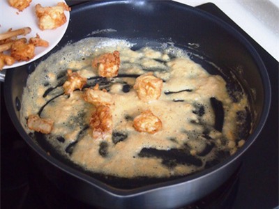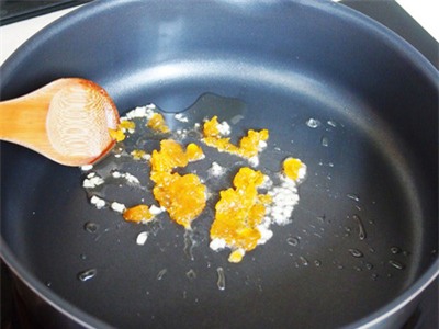 ![]() | ![]() Làm nóng chảo trở lại với chút dầu láng mặt, cho trứng muối và tỏi bằm vào đảo thơm. |