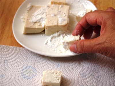 ![]() | ![]() Đậu phụ cắt miếng vuông nhỏ cỡ 2cm. Lăn từng miếng đậu qua một lớp bột bắp rồi xếp ra đĩa hoặc mặt bàn có lót khăn giấy. |