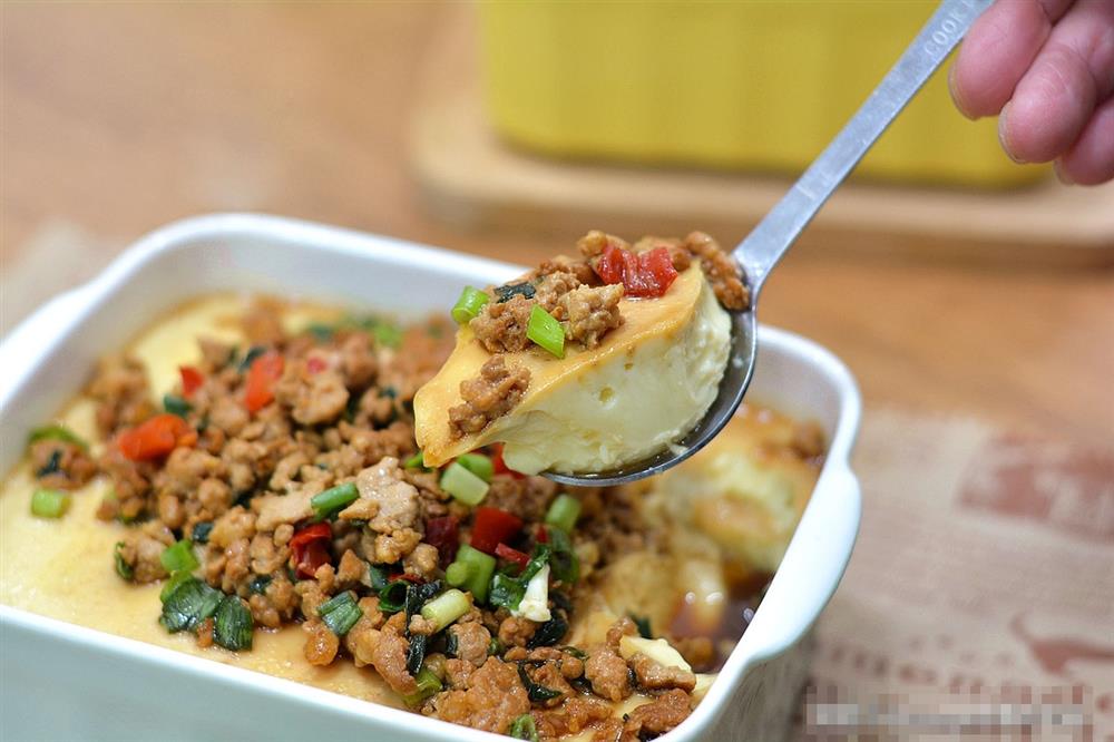 7. Sau khi lấy đậu phụ hấp trứng ra khỏi nồi hấp, đổ thịt băm lên trên rồi thưởng thức.