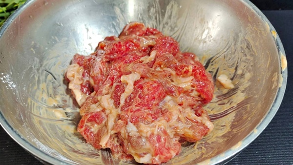 Bước 1: Thịt bò bạn mua về đem rửa sạch và ngâm trong nước có pha chút rượu nấu ăn khoảng 15 phút để loại bỏ lượng máu thừa cùng tạp chất. Sau đó vớt thịt bò ra, rửa lại thật sạch dưới vòi nước. Dùng khăn bếp thấm khô thịt bò rồi thái thành miếng mỏng. Để thái thịt bò mỏng và dễ hơn, bạn có thể cho thịt bò vào ngăn đá tủ lạnh khoảng 15 phút. Cho thịt bò đã thái vào tô, thêm chút muối, bột tiêu đen vào trộn đều. Tiếp đó lần lượt cho nước tương, nước tương đen và dầu hào vào trộn đều. Sau đó cho 1 thìa canh tinh bột bắp vào, trộn đều rồi ướp trong khoảng 15 phút.