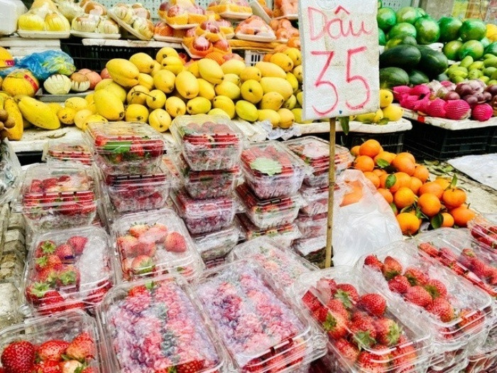 Tại các chợ dân sinh và nhiều tuyến phố ở Hà Nội, không khó để bắt gặp những sạp hàng bày bán dâu tây với mức giá dao động từ 20.000 – 80.000 đồng/hộp 500g, tùy theo kích thước. Các hộp dâu được bọc màng chống sốc và kèm gói chống ẩm, nhưng không có nhãn mác hay thông tin nguồn gốc cụ thể.