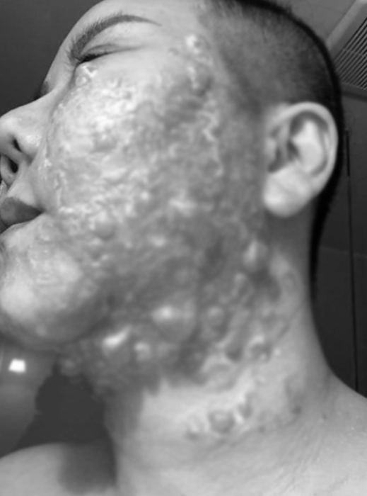 Tuy nhiên, chỉ vì lí do không tìm hiểu kĩ càng địa chỉ thẩm mỹ viện uy tín và có tay nghề, khuôn mặt của cô đã bị bỏng nặng. Có thể thấy các hạt rộp nước to chạy dài hai bên má xuống tận vùng cổ. (Lưu ý, hình ảnh có thể khiến bạn sợ hãi, cân nhắc trước khi xem).