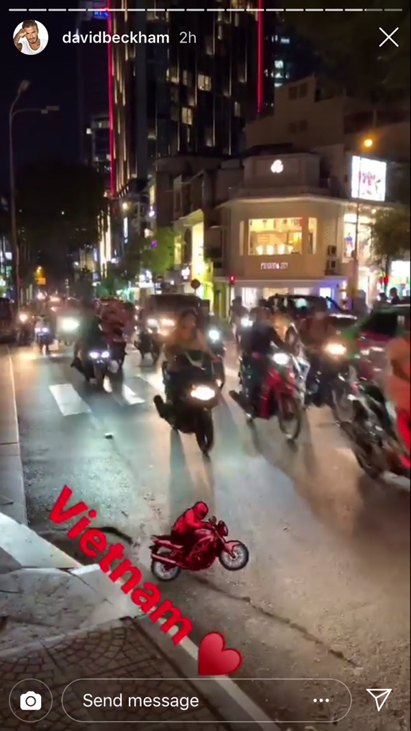 Sau chuỗi hoạt động dự sự kiện, họp báo tại TP.HCM trong vỏn vẹn 24h, David Beckham đã rời khỏi Việt Nam vào tối qua (9/3). Bất ngờ hơn cả, Beckham đã khoe clip phố phường Sài Gòn đông đúc cùng ảnh selfie đầy rạng rỡ và thậm chí còn "thả tim" lên story Instagram chính thức của anh vào khoảng 12h đêm. Đây đều là video và ảnh anh ghi lại khi đi dạo phố vào tối ngày 8/3
